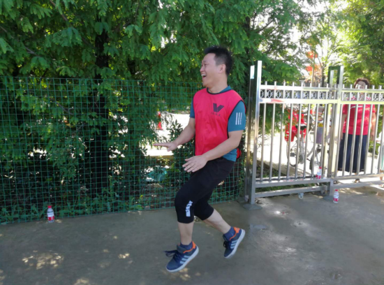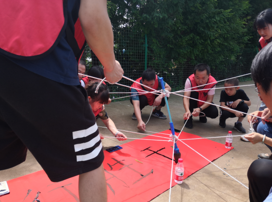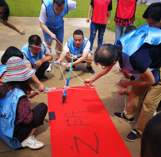 神筆馬良又稱妙筆生花,所有隊(duì)員拉繩子的末端,在不接觸毛筆的情況下,按照教練的要求完成指定的詞語。我們紅隊(duì)得到的詞語是“行勝于言”,藍(lán)隊(duì)的詞語是“心之所馳”,在我們兩隊(duì)成員的共同努力下,出色的完成了任務(wù)。